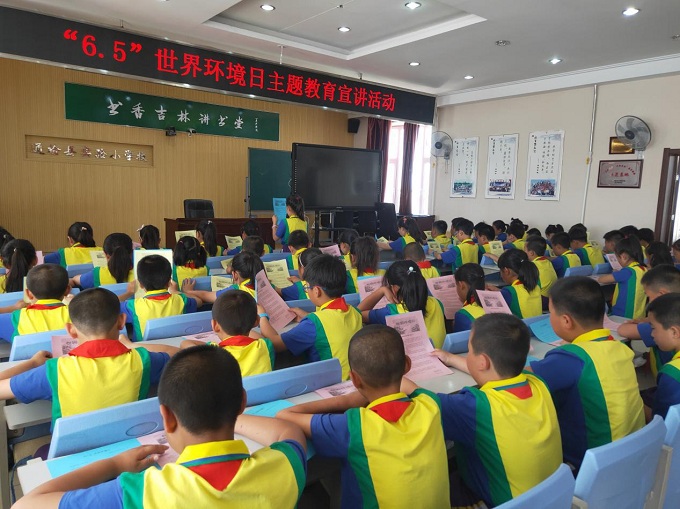 活动中,通榆县环境保护局重点围绕生态文明建设、环保政策、环保常识等方面进行宣传,引导师生履行绿色生活公约,普及环保常识,让他们了解世界环境日的由来,学习环境文化、环境道德等环保知识。小学生代表还宣读了2019世界环境日倡议书,并集体庄严宣誓。倡议师生牢固树立保护环境从我做起,从身边小事做起的思想,积极践行节约用水、节约用电、珍惜纸张、爱护花草树木、垃圾分类投放等勤俭节约、绿色低碳、文明健康的生活方式,并带动家人、朋友主动爱护环境,营造人人关心环保、支持环保、参与环保的浓厚社会氛围,携手共建美丽通榆。