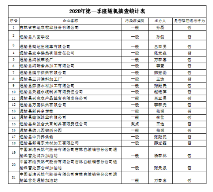 2021年第一季度污染源随机抽查工作已完成,抽查企业共21家,其中一般污染源企业20家,重点污染企业1家。在抽查现场中发现存在环境违法行为企业有0家。