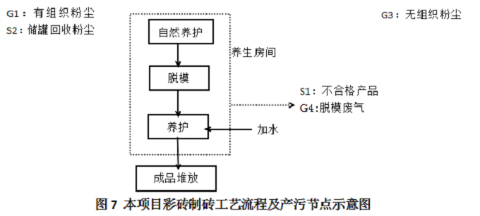 制砖过程是将配制好的混凝土送入制砖机中,待成型后的产品与模具一起放入养生棚内自然养生,检验后出厂销售,其中泡沫砖制砖过程还要用到水泥发泡机,本项目泡沫砖不使用发泡剂,是利用压力将空气打入半成品砖料中,得到低密度泡沫砖,然后进行自然养护,脱模,加水养护等工序。