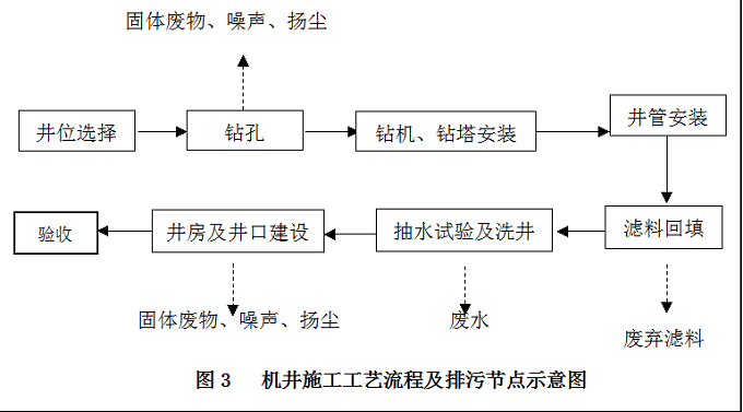 工序:井位选择→钻孔→钻机安装→钻塔安装→井管安装→滤料回填→抽水试验及洗井→井房及井口建设→验收。采用机械开挖为主人工开挖为辅,机井直径550m,深90m。