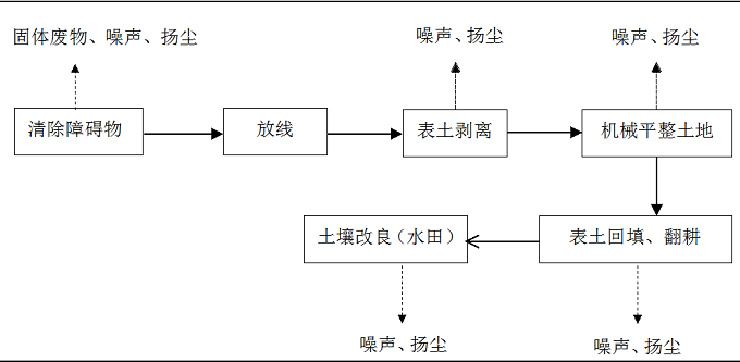 本项目道路分两级,分别为田间道和生产路,根据道路设计断面,道路施工主要为基层填筑和路面铺设。道路回填土方除利用就近排水沟开挖土方外,同时考虑土地平整剩余土方。道路施工顺序为:施工准备→测量放样→场地清理→填筑、压实基层→支立模板→洒水润湿基层→摊铺混凝土→振捣混凝土→提浆、刮平→机械抹平、抹光;→拆模养护→开放交通。此过程会产生扬尘、噪声、废水等污染物。