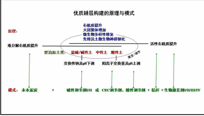 提质改造主要原理:针对复垦的土地整理农田,以富含难分解的腐殖酸/胡敏素天然资源材料-木本泥炭进行添加,迅速调控解决活性有机质、团聚体、微生物群落多样性、先锋沃土微生物种群驯化,机械化构建耕作层结构层次,快速创建复垦土地的优质耕作层,从而替代有机质难分解的长期培育过程。见图2。