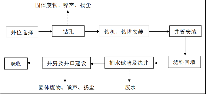 工序:井位选择→钻孔→钻机安装→钻塔安装→井管安装→滤料回填→抽水试验及洗井→井房、井口及进水池建设→验收。采用机械开挖为主人工开挖为辅,机井直径550m,深100m。