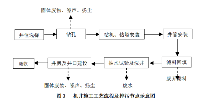 工序:井位选择→钻孔→钻机安装→钻塔安装→井管安装→滤料回填→抽水试验及洗井→井房及井口建设→验收。采用机械开挖为主人工开挖为辅,机井直径250m,深92m。