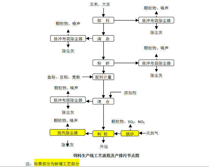 ⑶配料、混合:将各个配料仓中的原料,由每个配料仓下的喂料器向配料秤供料,并由配料秤对每种原料进行称重。每种原料的配料量由配料秤的控制系统根据生产配方进行控制,配料完毕,配料秤抖卸料门开启,将该批物料卸入混合机。物料卸空后,卸料门关闭,配料秤即可进行下一批物料的称重配料。然后将配料秤配好的一批物料中得各种原料组分混合均匀,达到所要求的混合均匀度。一些用料较少的添加剂则由人工称重后投入到混合机中,各种原材料在混合机中参与混合,混合后的散装饲料进入待制粒仓。混料过程中安装脉冲布袋除尘器,此工序产生颗粒物、噪声、除尘灰。