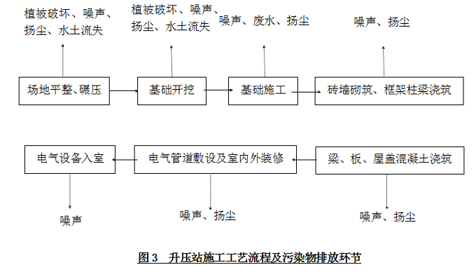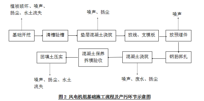 场内变电系统施工包括场内箱式变压器基础施工、高低压电缆的铺设、风电场接地施工、风电机组通讯施工,施工流程及污染物排放环节见图4