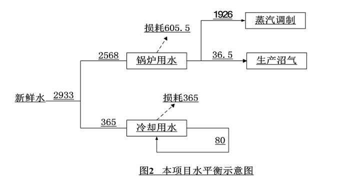 本项目所用职工6人,均为通榆一场原有职员,不新增人员,本项目建筑物地面采用干清方式。故本项目用水主要为锅炉用水及冷却循环补充水,本项目锅炉用水量为0.6t/h(2568t/a)、冷却循环补充水为1t/d(365t/a),锅炉用水量用于产生蒸汽,本项目总用水量为2933t/a。本项目用水由自打深水井供给,可满足用水需求。