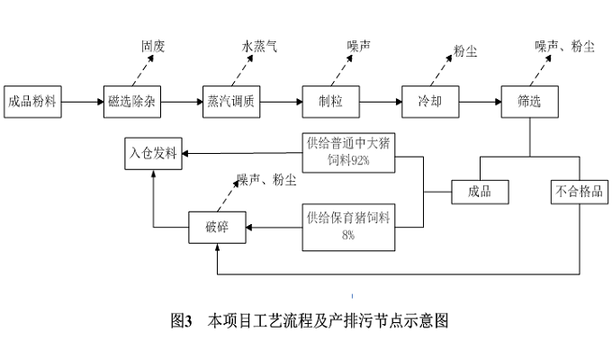 通过蒸汽加热物料,本项目蒸汽直接与物料接触,提高饲料的熟化程度、含水率以及营养成分的消化利用率, 同时杀灭部分有害物质,本项目成品颗粒含水率约为13%。