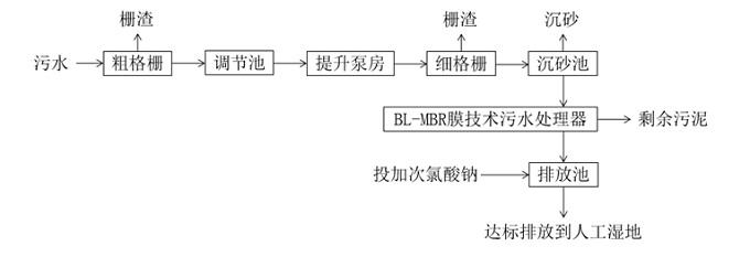 污水进入污水处理厂格栅池,去除大块的垃圾、浮渣、砂后,进入调节池,在调节池污水经提升泵提升后,后续处理流程均为重力自流。污水经提升泵提升进入沉砂池,在沉砂池内能从污水中分离比重较大的无机颗粒,既能保护水泵机组免受磨损,减轻沉淀池的负荷,又能使污水中无机颗粒和有机颗粒得以分离,便于分别处理和处置。污水再进入BL-MBR膜反应器,在BL-MBR膜生物反应器内,培养有大量的驯化细菌,在兼氧微生物的新陈代谢作用下,污水中的各类污染物得到去除。通过膜的过滤作用可以做到“固液分离”,从而保证污水中的各类污染物通过膜的过滤作用得到进一步的去除,保证了出水水质。处理后出水通过消毒装置,去除污水中的细菌、致病菌等有害物质后,出水达标排放。