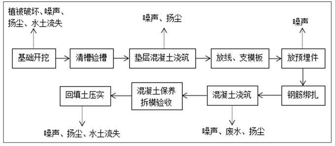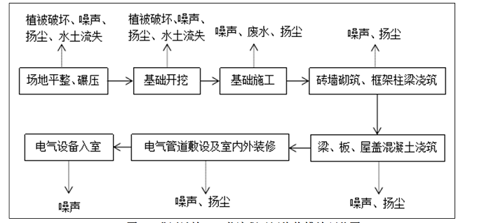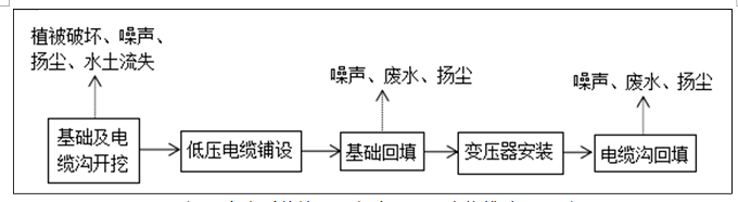 场内变电系统施工包括场内箱式变压器基础施工、高低压电缆的铺设、风电场接地施工、风电机组通讯施工,在风电机组基础施工的同时进行箱变基础的施工和电缆沟的开挖,在风电机组基础进行回填土前,进行低压电缆、接地的铺设,待电力电缆穿入风电机组基础后,进行风电机组基础土的回填,箱式变压器的安装,电缆沟的回填。施工流程及污染物排放环节见图4。