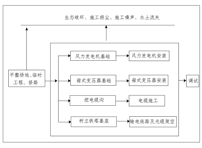 项目建设主要流程有以下几个阶段:前期准备阶段、主体施工阶段(风电机组安装,箱式变电站安装、集电线路安装、电缆敷设等)、绿化阶段以及交付使用后的运营阶段。