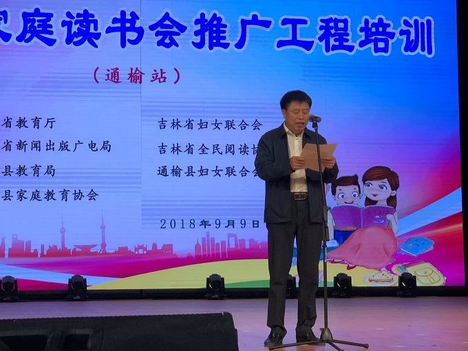 2018年9月9日,通榆县文化艺术中心里座无虚席,来自通榆县城乡各学校的领导、教师,部分家长代表在这里聆听了一场针对家庭读书会推广工程的培训。吉林省家庭读书会推广工程培训(通榆站)活动由吉林省教育厅、吉林省妇女联合会、吉林省新闻出版广电局、吉林省全民阅读协会联合主办,由通榆县教育局、通榆县妇女联合会、通榆县家庭教育协会联合承办。吉林省全民阅读协会副会长兼秘书长赵云良、吉林省全民阅读协会副秘书长代俊东、吉林省全民阅读协会副秘书长高宇、通榆县教育局局长颜景茂、通榆县妇联主席张丽玫、通榆县家庭教育协会会长孙慧娟参加了活动。