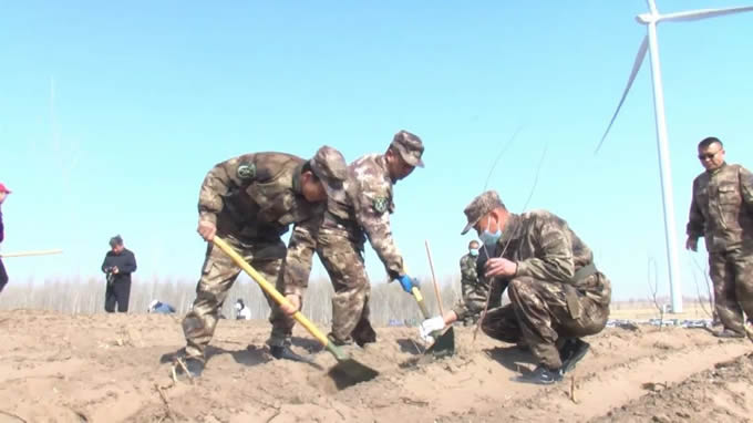 不负春光添新绿,植树造林正当时。这里是开通镇羊井子村三棵柳屯植树造林现场,虽然天气还很寒冷,但是绿化点却是一派热火朝天景象,通过镜头可以看到,来自县直机关干部、部队官兵和社会各界群众正在绿化点种下一株株树苗,为建设美丽通榆、推动绿色发展播下希望。