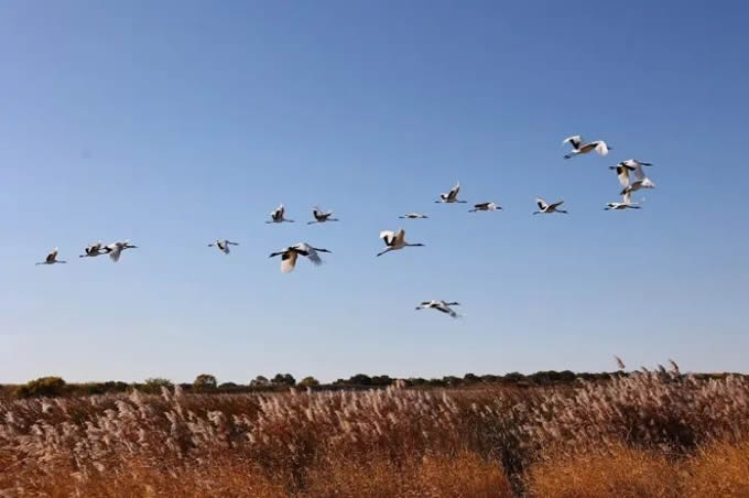 丹顶鹤是向海的符号。在向海国家级自然保护区仙鹤岛的芦苇深处,沼泽岸边,觅食、散步的丹顶鹤伴着落日,鹤舞翩翩。“仙鹤岛上有近百只丹顶鹤,一百多只大雁在这里安家落户,繁衍生息。”据景区工作人员介绍,仙鹤岛上植被多样,蒲草苇荡茂密连片,良好的生态环境,优雅的山水风光,给珍禽提供了极好的生存条件。800平方米的观鹤台,550延长米的栈桥栈道可以一览被誉为“吉林八景”之一的“向海舞鹤”。