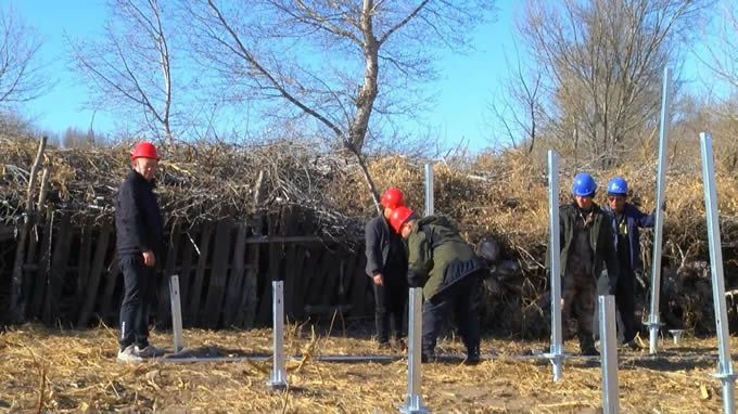 近日,记者在新华镇新民村户用分布式光伏兜底保障项目施工现场看到,几名工人在技术人员的指导下正在组装光伏发电设备。
