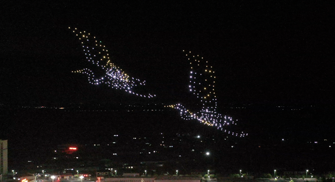 8月15日,值此日本宣布无条件投降80周年之际 ,为纪念中国人民抗日战争暨世界反法西斯战争胜利 80 周年,恰逢吉林省通友汇天智能技术有限公司落户通榆并实现产品下线,由该公司主办的 “通友汇天” 无人机首飞活动盛大启幕。活动以“智汇低空,首飞领航”为主题,数百架无人机编队与绚丽烟火秀交相辉映,既为全县人民献上了一场沉浸式视听盛宴,也向社会展示了我县在无人机技术应用领域的阶段性成果。夜幕中,数百架无人机化身“空中像素”,在天幕上编织出流动的光影长卷。我县行政地图轮廓率先亮起,绿色光点勾勒出湿地、草原与农田的生态脉络;转瞬之间,丹顶鹤振翅掠过“向海湿地”,水墨剪影生动逼真;涌动的湖泊里,光点组成的鱼群仿佛在“水韵鹤乡”的夜色中游弋,植保无人机与智慧农田图案联动,勾勒出现代农业的金色脉络,光影流转间,科技与发展的图景渐次铺展。最终,所有元素交融成活力澎湃的未来图景,点燃全场热情。当高空中的无人机编队正在热闹表演,地上的烟花按捺不住,伴随着响亮的声音腾空而起,在夜空中尽情舞动,或如繁花似锦,或似流星划过,与无人机编队的光影效果交相辉映,瞬间点亮了通榆的夜空,引得现场观众阵阵欢呼,将活动的热烈气氛推向高潮。?据了解,本次首飞活动于8月15日至16日每晚8点上演。这场科技盛宴充分彰显了无人机技术的发展成果与广阔应用潜力,将进一步推动无人机项目与本地产业链的深度对接,为通榆县培育新质生产力、促进经济社会高质量发展持续注入强劲动能。