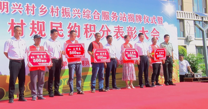 随着爆竹的阵阵声响,八面乡明兴村乡村振兴综合服务站揭牌成立。揭牌仪式上,明兴村对符合《明兴村村规民约加分细则》的中、高考状元和最美儿媳、疫情防控最美逆行者、春季防火禁烧、楼区环境卫生等工作有突出贡献的26名先进典型进行表彰,同时,还为70岁以上老人送上生日祝福。
