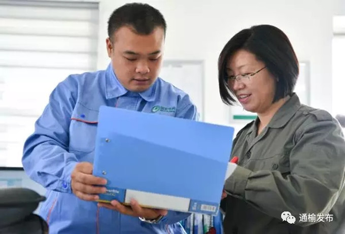 图为:单英纯与同事在瞻榆500千伏变电站办公室内沟通工作