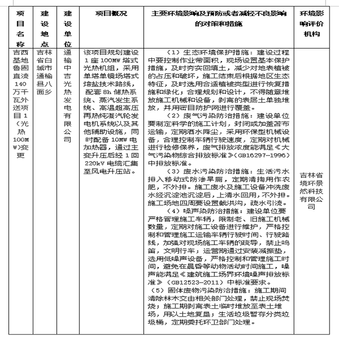 根据《中华人民共和国行政许可法》和建设项目环境影响评价审批制的有关规定,我局拟对《吉西基地鲁固直流140万千瓦外送项目1(光热100MW)变更环境影响报告表》进行审查。现将拟审查的环境影响评价文件基本情况予以公示,公示期为2个工作日。欢迎各界人士对项目建设的环境保护方面提出意见和建议。