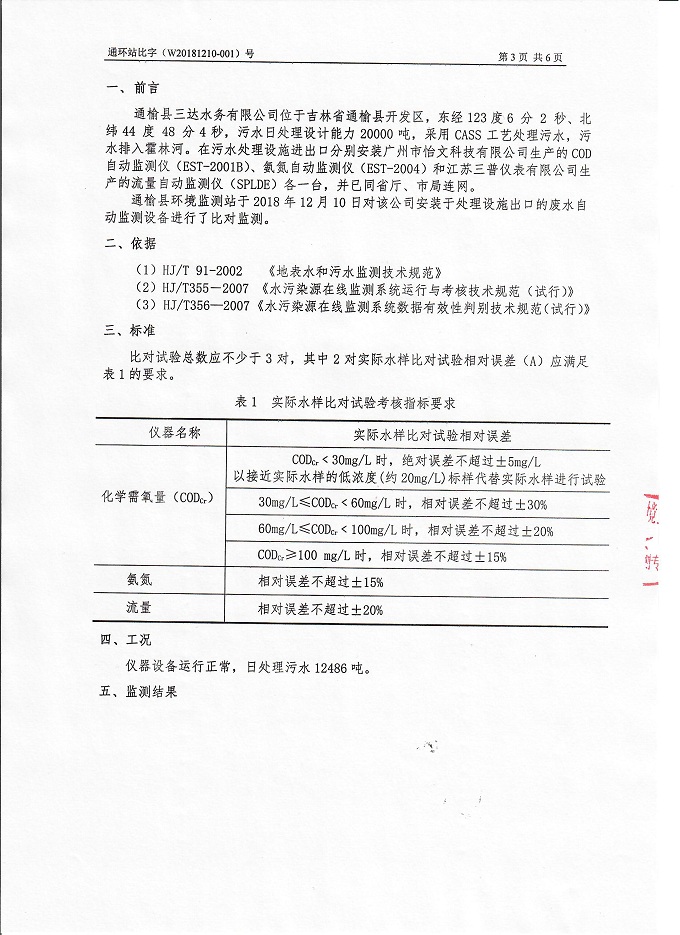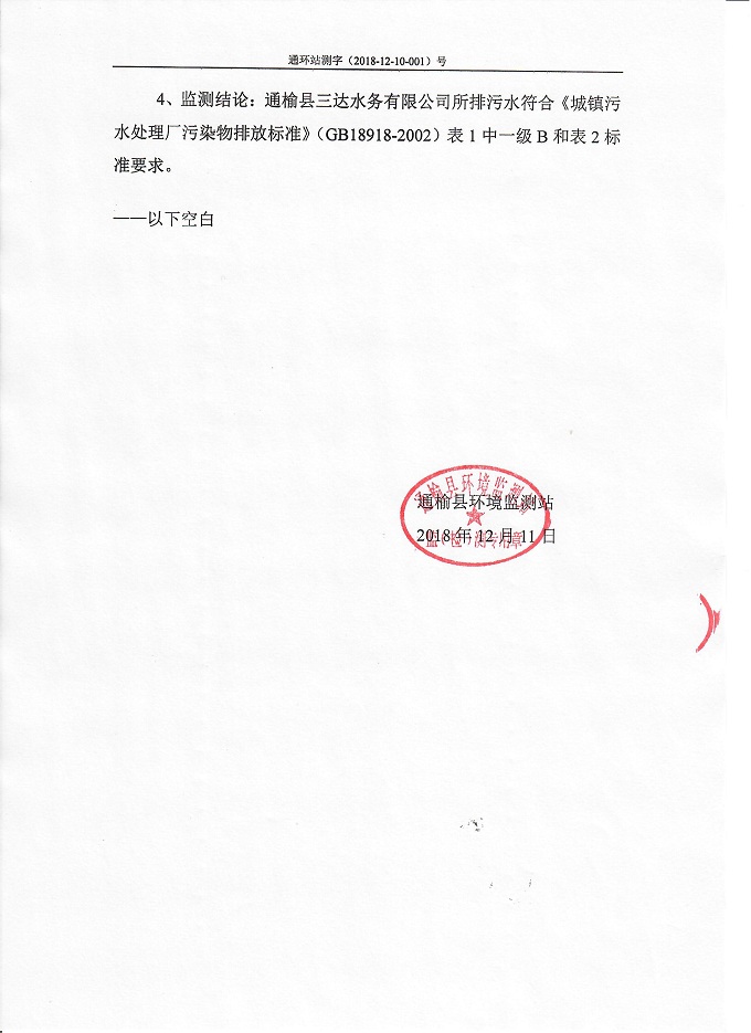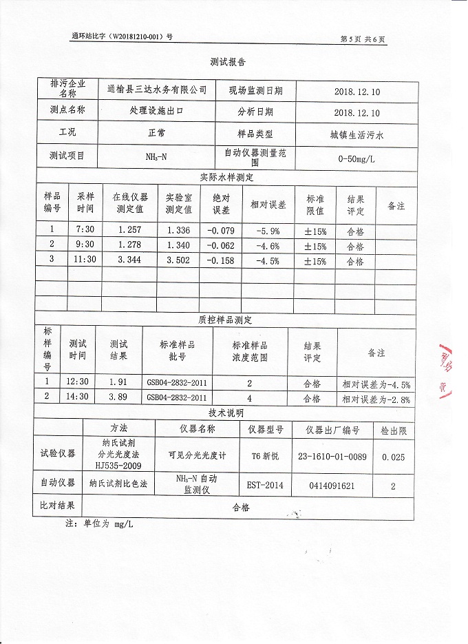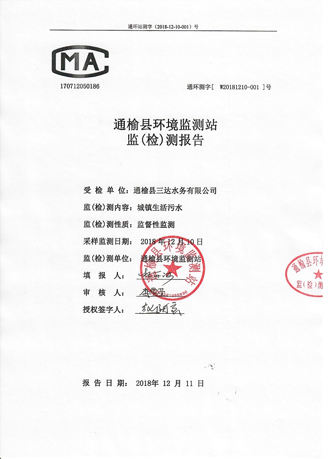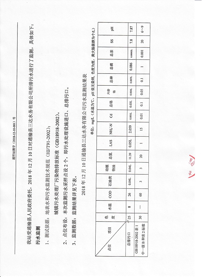 通榆县环境监测站受白城市环境监测站的委托,于2018年12月10日对通榆县三达水务有限公司污水总排污口水样进了采样监测及对在线监控设施进行了比对监测,具体数据见报告: