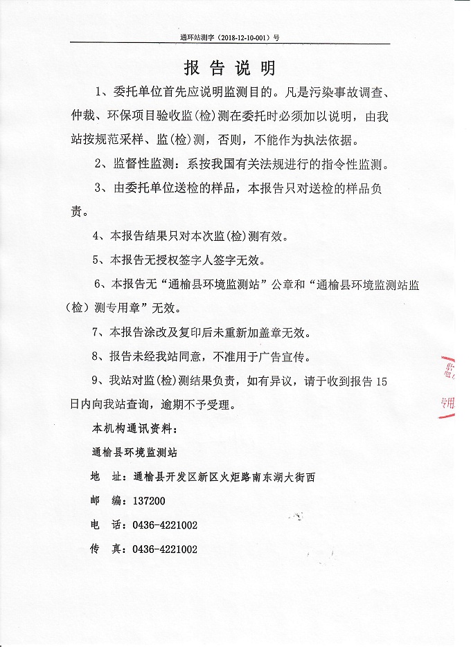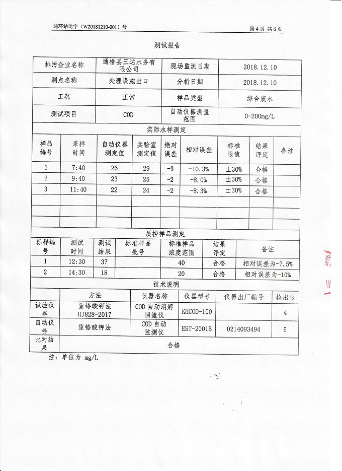 通榆县环境监测站完成了2018年第4季度对三达水务有限公司的监督监测和在线设施的比对监测