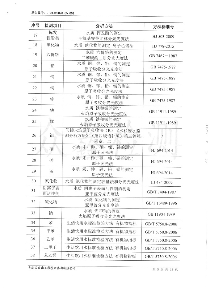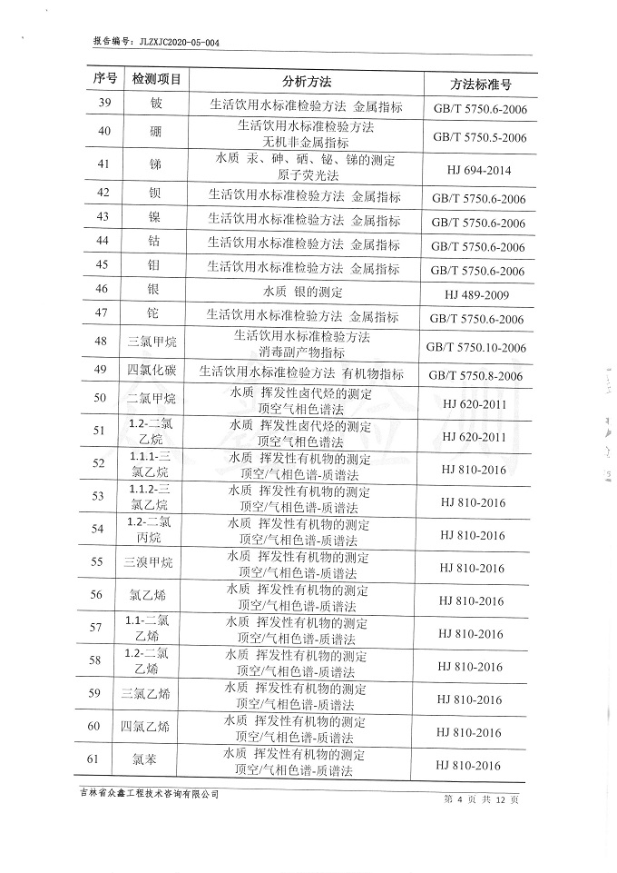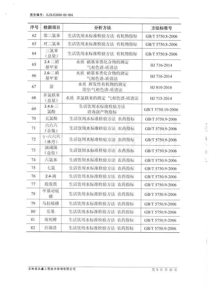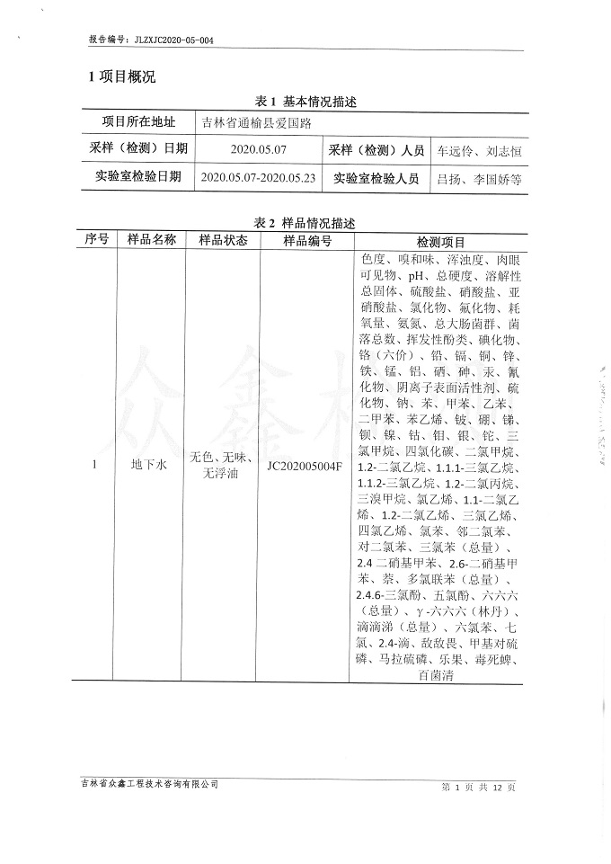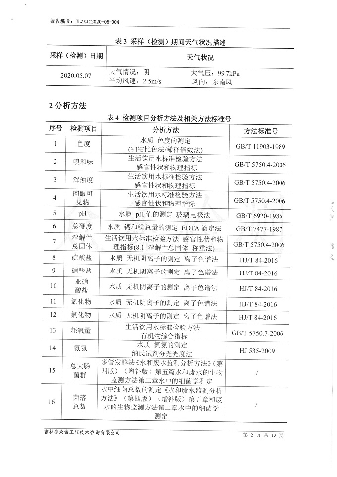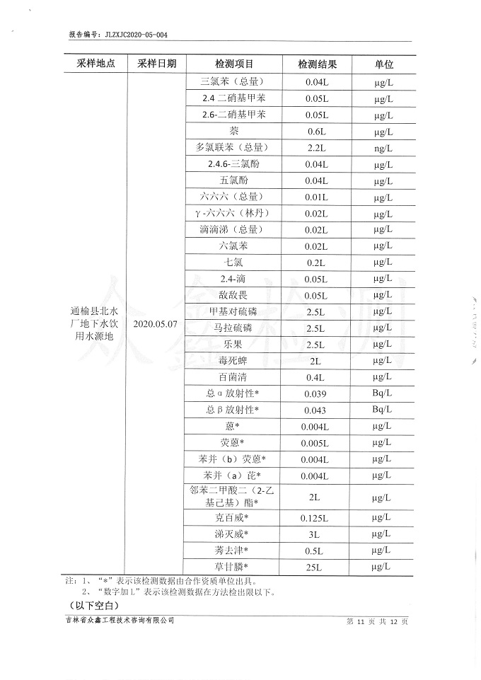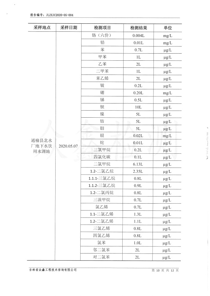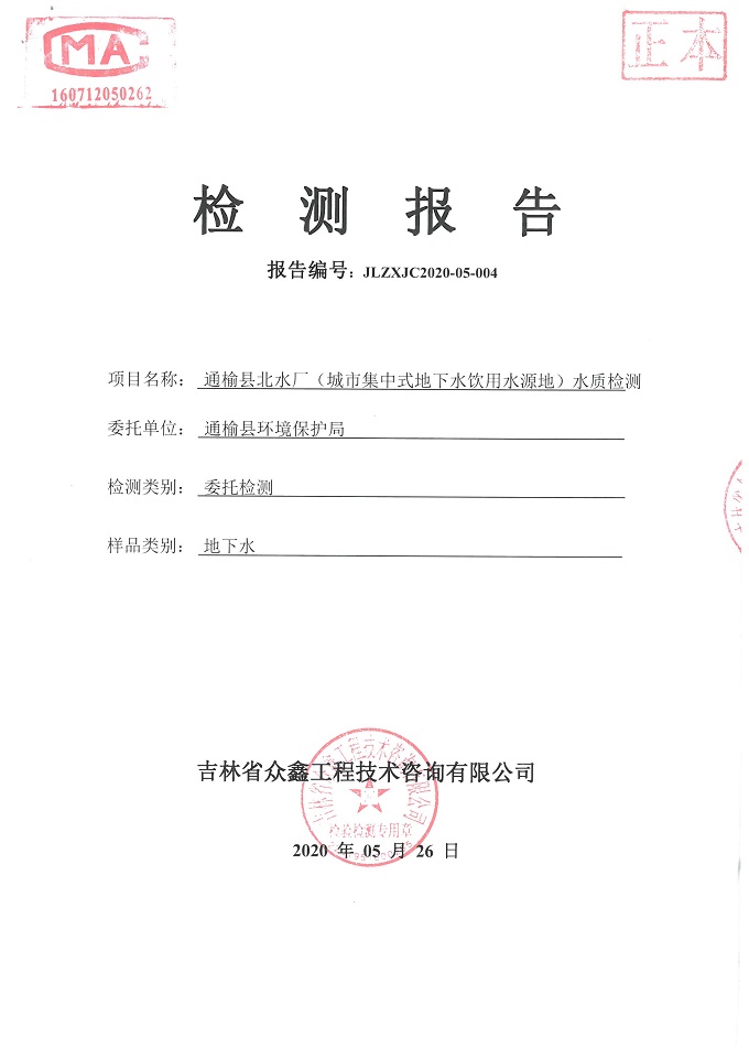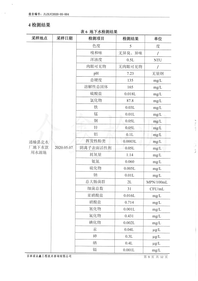 通榆县北水厂(城市集中式地下水饮用水源地)水质检测