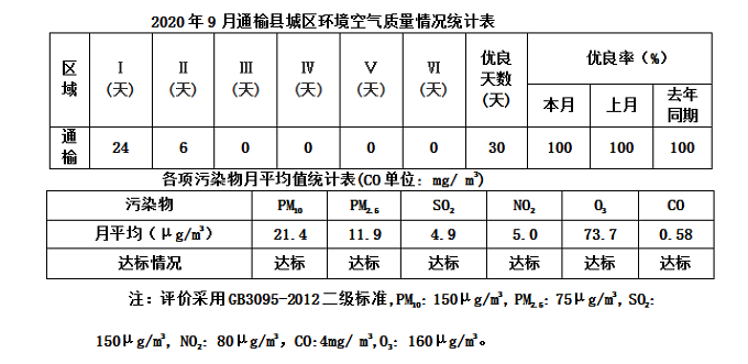 地址:通榆县生态大街与敬业路交汇处1888号 2020年9月,自动站运行正常,根据有效监测30天的监测结果,对照《环境空气质量标准》(GB3095-2012)中的二级标准(日平均值),二氧化氮月平均值为5.0微克/立方米,PM2.5月平均值为11.9微克/立方米,二氧化硫月平均值为4.9微克/立方米,PM10月平均值为21.4微克/立方米,CO月平均值为0.58毫克/立方米,O3月平均值为73.7微克/立方米,各项均符合环境空气质量二级标准。