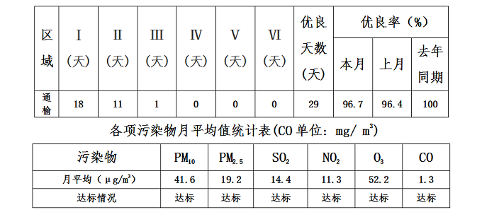 注:评价采用GB3095-2012二级标准,PM10: 150μg/m3, PM2.5: 75μg/m3, SO2: 150μg/m3, NO2: 80μg/m3,CO:4mg/ m3,O3: 160μg/m3。