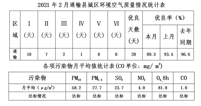 2021年2月,自动站运行正常,根据有效监测28天的监测结果,对照《环境空气质量标准》(GB3095-2012)中的二级标准(日平均值),PM10月平均值为58.2微克/立方米,PM2.5月平均值为27.7微克/立方米,SO2月平均值为23.7微克/立方米,NO2月平均值为4.0微克/立方米,O3_8h月平均值为81.8微克/立方米,CO月平均值为1.0毫克/立方米,各项均符合环境空气质量二级标准。