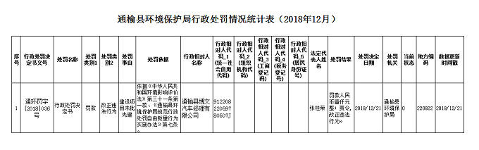 通榆县环境保护局行政处罚情况统计表(2018年12月)