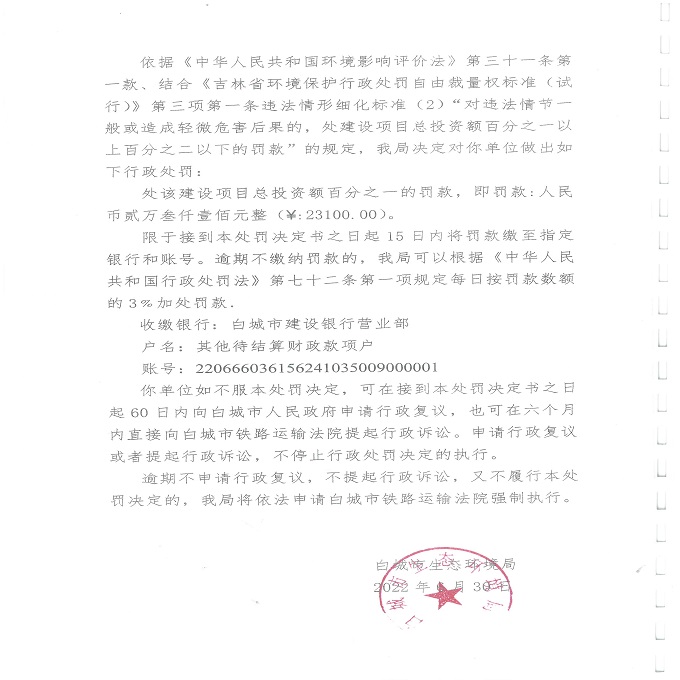 白城市生态环境局行政处罚决定书