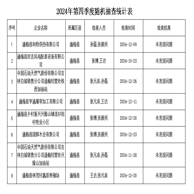 白城市生态环境局通榆县分局2024年第四季度随机抽查工作情况