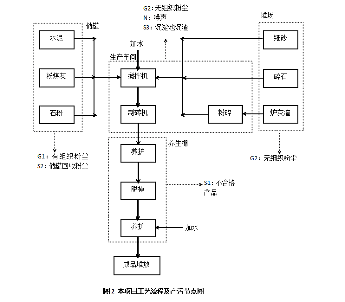 本项目生产过程中所有工序均为物理过程,石子、沙子经计量后送入搅拌机内。罐仓内的水泥等通过管道经计量送入搅拌机内,各种原料在搅拌机内与水混合搅拌。配制好的混凝土送入制砖机中,待成型后的产品与模具一起放入养生棚内自然养生,检验后出厂销售。