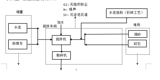 本项目生产过程中所有工序均为物理过程,细砂和碎石经计量后送入搅拌机内。罐仓内的水泥和粉煤灰等通过管道经计量送入搅拌机内,各种原料在搅拌机内与水混合搅拌(水泥:粉煤灰:细砂:碎石:水=15:13:18:6:7)。