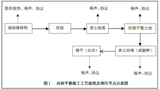 项目田间道路共设两级,分为田间道和生产路两级,其中生产路路面宽3m,田间道路面宽3.5m,道路两侧布置路边沟,用于排除道路积水以及田内部分积水。根据道路设计断面,道路施工主要为基层填筑和路面铺设。道路回填土方除利用就近排水沟开挖土方外,同时考虑土地平整剩余土方。道路施工顺序为:施工准备→测量放样→场地清理→填筑、压实基层→支立模板→洒水润湿基层→摊铺混凝土→振捣混凝土→提浆、刮平→机械抹平、抹光;→拆模养护→开放交通。此过程会产生扬尘、噪声、废水等污染物。