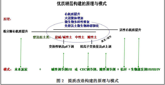提质改造主要原理:针对复垦的土地整理农田,以富含难分解的腐殖酸/胡敏素天然资源材料-木本泥炭进行添加,迅速调控解决活性有机质、团聚体、微生物群落多样性、先锋沃土微生物种群驯化,机械化构建耕作层结构层次,快速创建复垦土地的优质耕作层,从而替代有机质难分解的长期培育过程。见图2。