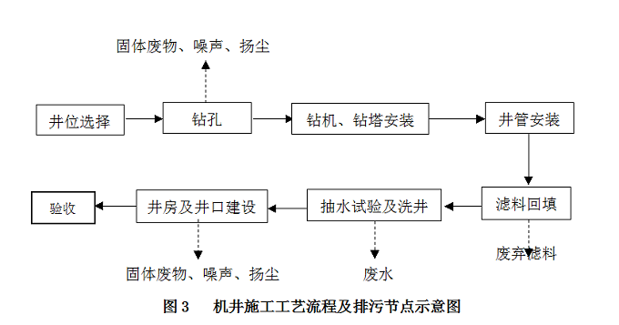 工序:井位选择→钻孔→钻机安装→钻塔安装→井管安装→滤料回填→抽水试验及洗井→井房及井口建设→验收。采用机械开挖为主人工开挖为辅,机井直径250m,深92m。