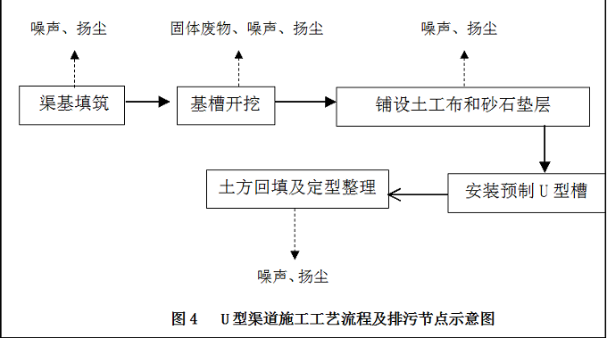 工序:渠基填筑→基槽开挖→铺设土工布和砂石垫层→安装预制U型槽→土方回填及定型整理。