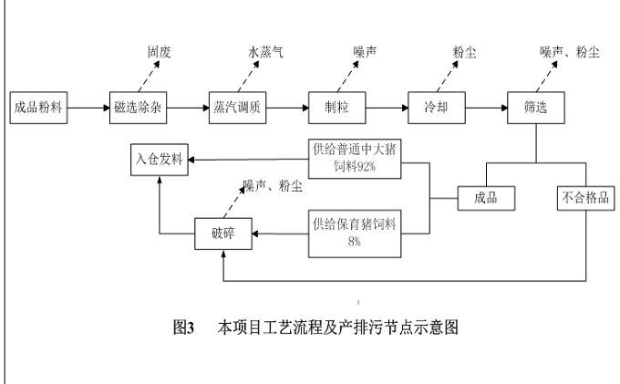 通过蒸汽加热物料,本项目蒸汽直接与物料接触,提高饲料的熟化程度、含水率以及营养成分的消化利用率, 同时杀灭部分有害物质,本项目成品颗粒含水率约为13%。