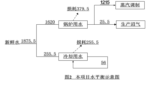 本项目所用职工6人,均为通榆二场原有职员,不新增人员,本项目建筑物地面采用干清方式。故本项目用水主要为锅炉用水及冷却循环补充水,本项目锅炉用水量为0.6t/h(1620t/a)、冷却循环补充水为0.7t/d(255.5t/a),锅炉用水量用于产生蒸汽,本项目总用水量为1875.5t/a。本项目用水由自打深水井供给,可满足用水需求。