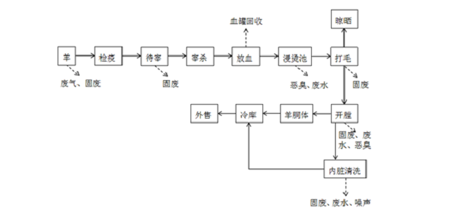 本项目主要屠宰肉羊,和原有项目相比工艺未发生变化。生产工艺流程及排污节点示意图见图4。