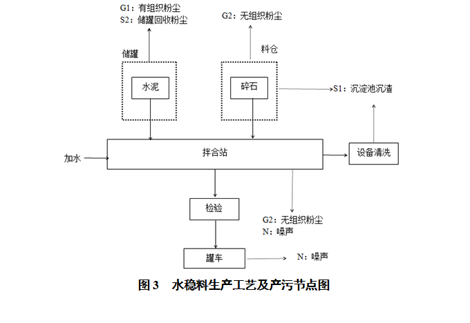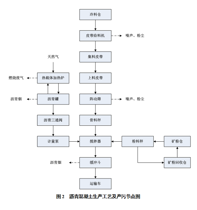 图1 工程建设工艺流程及产物环节图 2.营运期工艺流程及产污环节 本项目主要生产沥青混合料、水稳料,项目营运后预计年加工沥青混合料54951m³,水稳料205953m³,具体工艺流程及产物环节如下: (1)沥青混合料 沥青混合料搅拌设备是在规定的温度下将不同粒径骨料、填料和沥青按设计配合比混合搅拌成均匀的混合料的工厂式成套设备,广泛应用于高等级公路、城市道路、机场、码头、停车场等工程施工。它是沥青路面施工的第一关键设备,其性能直接影响沥青路面的质量。 通常沥青混凝土搅拌设备有间歇式和连续式两种。连续式工艺流程简单,设备简化。而间歇强制式搅拌设备,由于骨料二次筛分,各种组分按批次计量,强制搅拌混合,能可靠保证级配,粉料与沥青的计量也可达到相当的精度;所以拌制的沥青质量好,可满足各种施工要求,本项目选用间歇式设备。 ①机械部分工艺流程: 沥青混合料搅拌设备的主要工艺特征是:各种成分是分批次计量.依事先设定顺序投入搅拌器进行强制搅拌,卸出拌和好的成品料后,接着进行下一个循环,形成周而复始的循环作业过程。所谓间歇式,就是指这种分批次计量、搅拌生产模式。 用装载机将不同规格的砂石料铲入对应的冷料仓内:经山变频器控制的(变频器参数根据级配类型、产量和配合比事先设定)皮带给料机容积计量后,经山集料皮带机、上料冷料皮带机输送到筛分机。本项目使用环保型拌合设备,骨料通过拌合器与加热沥青混合,无需单独进行骨料烘干。 通过筛分机将骨料筛分成五种规格,分别流进五个储仓存储起来。按照设定的比例,五种规格的骨料按先小后大的次序分批投入石料计量仓内累加计量:同时沥青供给系统送来的热沥青和粉料供给系统送来的粉料,分别按设定的配比投入到各自的计量装置内计量。称重完毕后,依事先设定顺序投入到搅拌锅内进行强制搅拌。搅拌好的成品料直接卸到运料自卸卡车中,也可选择卸到成品料提升小车中,经卷扬机提升卸到成品料仓内储存。 控制系统依靠各个传感器检测到的信号,对物料配比、沥青含量、拌和料温等重要参数进行实时监控,从而确保所生产的拌和料质量能满足用户的使用要求。在整个工艺流程中电控系统还设有连锁保护装置,使设备免遭意外机械事故。 需要说明的是,冷料通过皮带给料机的容积计量是预计量,经筛分的骨料、粉料和热沥青的计量是精确计量。因为有二次计量,它能保证混合料的级配,骨料、粉料和沥青的比例精确度比较高。目前,骨料和粉料的静态计量精度不超过±0.5%,沥青的静态计量精度不超过士0.25%。由于是间歇式搅拌,改变混合料配合比也很方便,可以做到不停机更改或更换配方。 ②沥青导热油加温系统 沥青导热油加温系统的工作原理是:传热介质导热油在一个密闭的循环系统中。从燃烧器吸收天然气燃烧时释放的热量,使温度升高,高温的导热油通过循环管道加热沥青以及沥青管道.降温后的导热油经过再次加温,周而复始.直至沥青和管道达到所需的温度。由于现在多数系统的燃烧器采用可编程控制器(PLC)控制,性能稳定,所以沥青导热油加温系统也可称为“无人守自动加温系统”。要使其安全可靠地发挥最大的效益,正确使用与维护是关键。 本装置利用自动燃烧器将导热油加热至180-210℃,并通过循环泵,对沥青罐、沥青计量仓、及沥青管道等进行加热保温,将沥青等加热到所需的温度。 ③搅拌系统 进入搅拌缸的物料等经与热沥青拌合后才成为成品,整个过程都在密闭系统中进行。成品出料由小斗车经滑道提升到成品仓后装入运输车斗送出。由于搅拌锅为密闭结构,在搅拌混合过程中并不产生废气。只有在搅拌好的成品卸料时会产生微量沥青烟无组织排放。 ④沥青烟主要的产生环节如下: A.原料沥青输入沥青储罐过程中,首先经过卸料池暂存,再由沥青泵将沥青从 卸料池打入储罐,卸料池为封闭结构,设有呼吸孔1个,卸料池接纳沥青时将从顶部 呼吸口产生少量沥青烟,随着卸料过程的结束,沥青烟不再产生。 B.沥青加热器和沥青储罐顶部呼吸口在沥青加热的过程中将连续产生沥青烟; C.搅拌缸卸料过程中,沥青混凝土直接落入运输车辆,在此过程中将产生无组 织排放的沥青烟。 混合搅拌:沥青原料及石材骨料经初加工后经计量配比进入搅拌仓进行拌合均匀,根据客户需求决定是否加入矿粉,搅拌完成后直接通过出料口输入至运输车内外售。 ⑤活性炭吸附措施可行性分析: 根据相关资料调查,对苯并芘气体的沥青烟的治理可采用的措施有燃烧法、冷凝法、吸收法、吸附法等,较为常用的主要为燃烧法河吸附法。其中,燃烧法处理效率最高,但需要另行建设焚烧炉,燃烧温度应达到900℃左右,初始投资较大,适用于沥青烟气产生量较大的企业。而吸附法的优点是投资省、治理效率高,适用于沥青烟气量较少的项目。结合本项目实际情况,沥青烟可收集的部分主要为卸料池、加热器顶部呼吸口所排放的沥青烟,烟气量较少,因此,本评价推荐采用活性炭吸附法治理此部分沥青烟。 具体生产工艺流程及产污环节见图2。 (2)水稳料 水稳料生产工艺均为物理过程,生产时首先将各种原料进行计量配送,然后进行重量配料,之后进行强制配料,强制配料过程采用电脑控制,从而保证水稳料的品质,搅拌后的混凝土进入混凝土泵车,运往工地。 具体