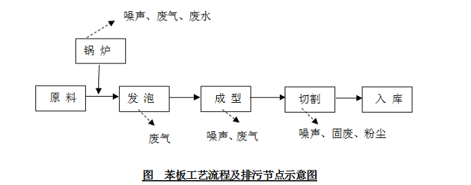 本项目主要生产工序为采用聚苯乙烯塑料颗粒经发泡机加热膨胀后进入成型机进行挤压定型后,再经生产车间内的切割机根据客户需要切割后出厂。由于原料为塑料泡沫颗粒,所以在高温下有微量的气体挥发,成分为TVOC(以非甲烷总烃计),此外,在切割工序会有废料产生。生产设备及锅炉会产生噪声。其工艺流程及排污节点示意图详见下图。