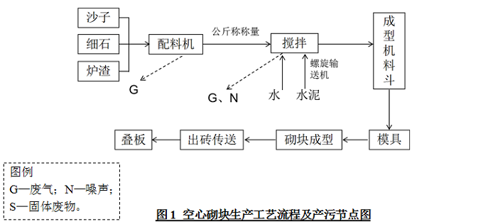 工艺生产流程:沙子、细石、炉渣原料进入配料机,经计量后送入搅拌机内。罐仓内的水泥通过螺旋输送机经计量送入搅拌机内,各种原料在搅拌机内与水混合搅拌。配制好的混凝土送入液压系统中,待成型后的产品进行自然养生,检验后出厂销售。