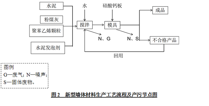 主要原材料为水泥、粉煤灰、聚苯乙烯颗粒,水泥和聚苯乙烯颗粒经过发泡剂发泡,无需进行加热发泡,先将硅酸钙板置于模具两侧,将水泥、粉煤灰、聚苯乙烯颗粒和水泥发泡剂搅拌后,通过计量设备计量后浇筑入模具内成型,不合格产品经封闭的破碎机(含喷水头)破碎后重新搅拌,合格产品进行自然养护,经过养护后成品码垛。各种原材料均为成品,不需要二次加工。