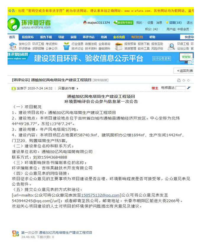根据以上规定,通榆加亿风电塔筒有限公司在确定设计方案并委托环评机构后,对建设项目进行第一次公开公示,公示日期为2020年7月24日-2020年8月6日,公示网址为http://www.eiafans.com/thread-1315091-1-1.html。同时,为了引导更多的公众关注此项目,还在当地公告栏及附近村屯对项目环评进行了两次公告,公告日期分别为2020年7月26日和8月2日;在建设项目环境影响报告书征求意见稿形成后,对建设项目进行公开公示,公示日期为2020年8月7日-2020年8月20日(10个工作日),公示网址为http://www.eiafans.com/thread-1315091-1-1.html。同时,为了引导更多的公众关注此项目,还在白城日报报纸对项目环评进行了两次公告,公告日期分别为2020年9月9日和9月10日。