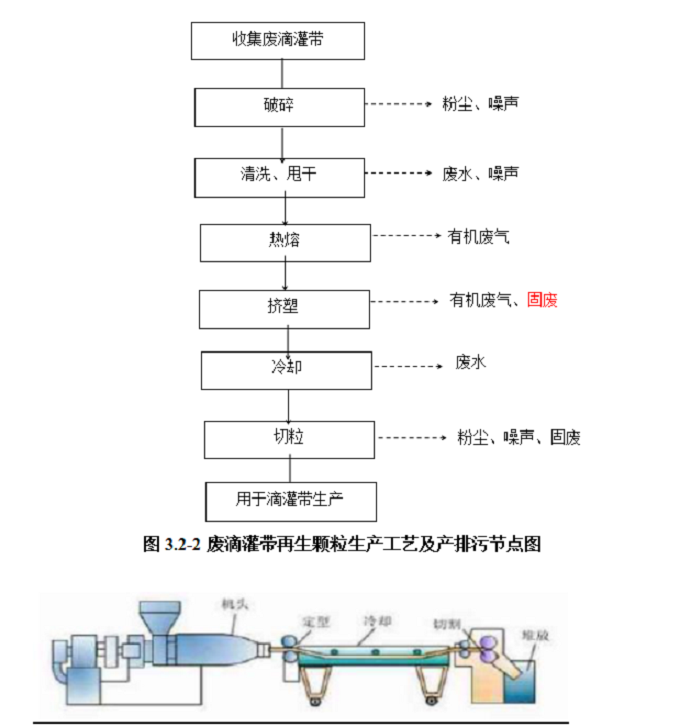 本项目滴灌带是利用企业生产的塑料颗粒(属于再生料)及外购的滴灌带原料(聚乙烯树脂颗粒)生产滴灌带。本项目生产的滴灌带采用先进的生产设备,进料后滴灌带设备用电能将塑料颗粒加热热熔,经设备内模具,出料、自然冷却后入库。