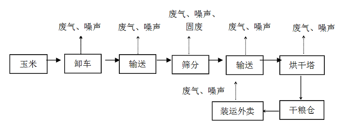 企业首先对收购玉米进行检验,干粮直接存储,主要检查玉米的霉变率和含水率,检测出霉变的玉米作为杂质(固体废物)处理,然后进行筛分,筛分出土、秸秆杂物、碎屑等杂质;筛分后由塔前提升机送到烘干设备烘干,然后对烘干后的玉米进行直接出售或贮存。