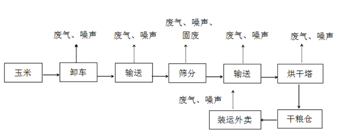 企业首先对收购玉米进行检验,干粮直接存储,主要检查玉米的霉变率和含水率,检测出霉变的玉米作为杂质(固体废物)处理,然后进行筛分,筛分出土、秸秆杂物、碎屑等杂质;筛分后由塔前提升机送到烘干设备烘干,然后对烘干后的玉米进行直接出售或贮存。