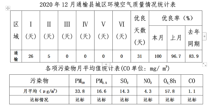 在本月监测的31天中,有效监测天数为31天,通榆县城空气质量状况为优良的天数为31天,优良率100%。